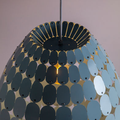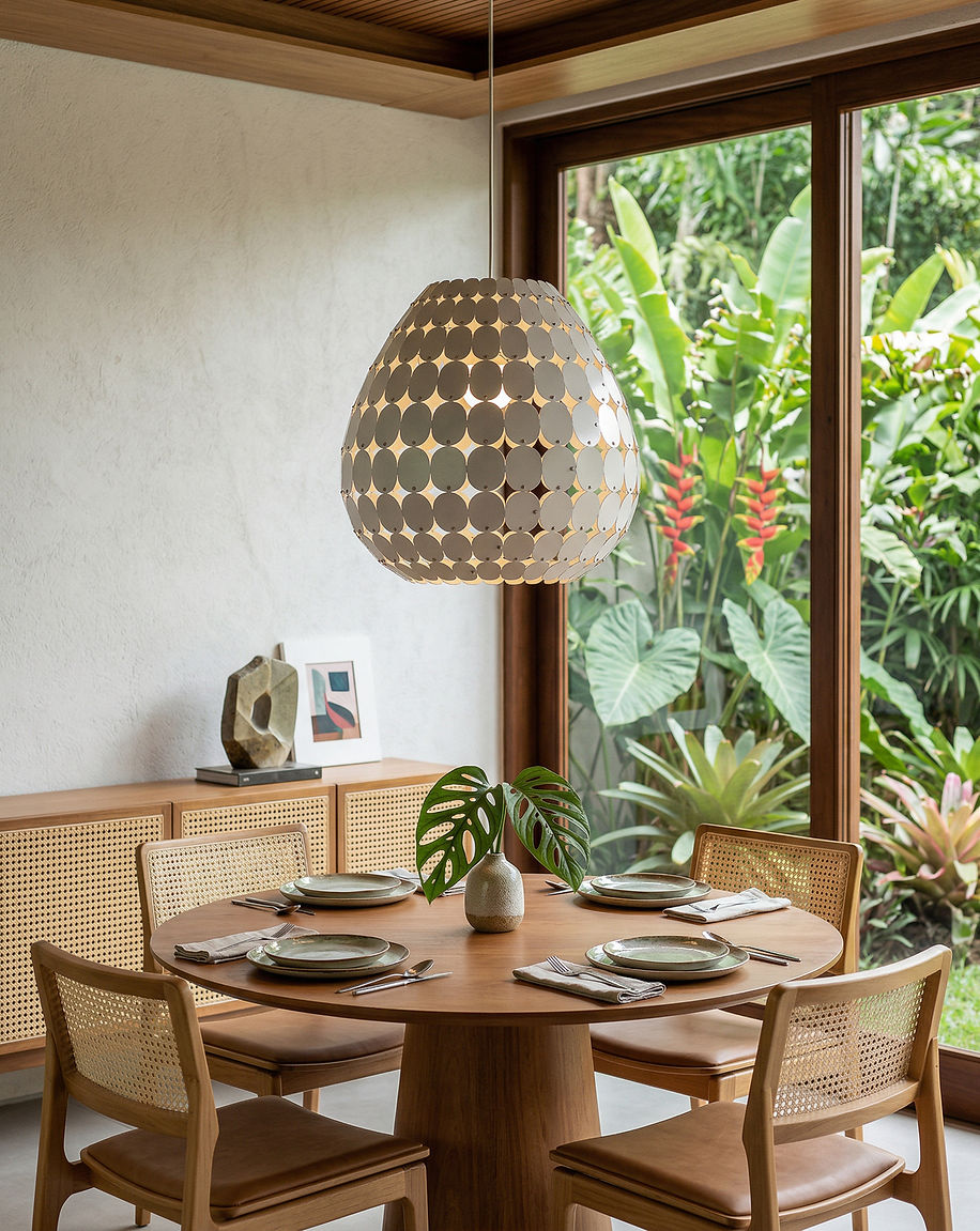 A MOEDA projeta a luz através de suas camadas, criando efeitos gráficos e um jogo visual dinâmico no entorno. Mais do que iluminar, a peça introduz movimento e um ar lúdico ao espaço. Pode ser utilizada como ponto focal em salas de jantar, halls ou ambientes de transição, onde a luz também atua como elemento de composição.